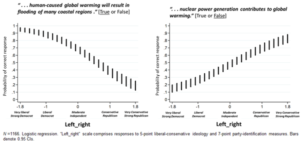 Subjects of opposing political outlooks—and hence opposing “beliefs” about human-caused climate change--don't disagree about whether “human-caused global warming will result in flooding of many coastal regions” or whether “nuclear power generation contributes to global warming” when those true-false statements are introduced with the prefix “according to climate scientists” (obviously, the "nuclear" item is a lot harder--that is, people on average, regardless of political outlook, are about as likely to get it wrong as right; "flooding" is a piece of cake).